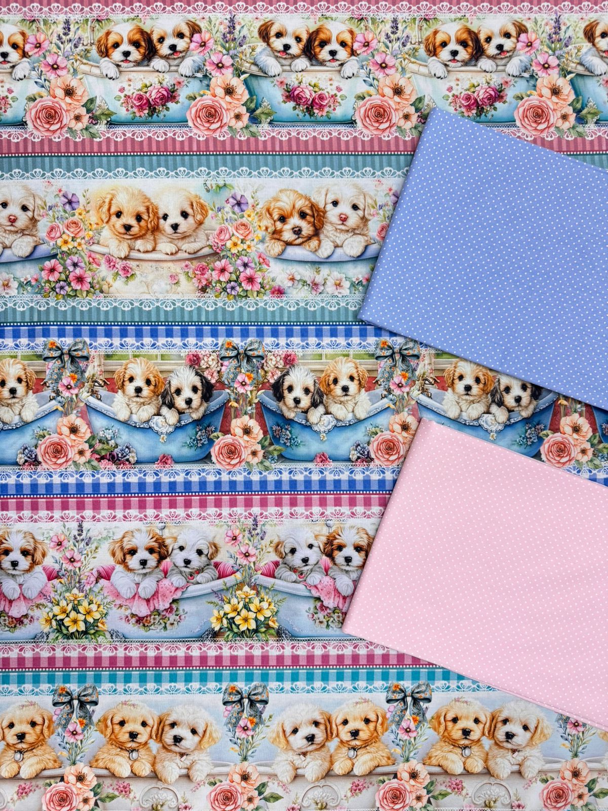 1 corte Tricoline Poá rosa Bebê medindo 0,55 x 1,50 cm.