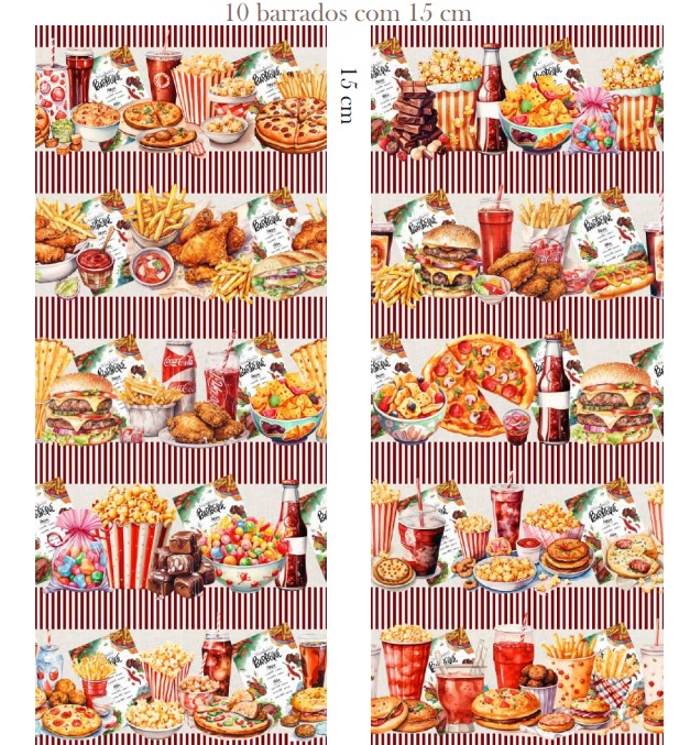 Tecido Tricoline Estampado Digital Barrado medindo 55cm x 150cm. Faixas perfeitas para trabalhos como apliques em toalhas, bolsas, barrados de cortinas, bandos entre outros projetos. Com 10 faixas por corte, cada faixa possui em media 15 cm, nossos tecidos possuem também um ótimo custo benefício, principalmente para as artesãs que irão vender as peças prontas.